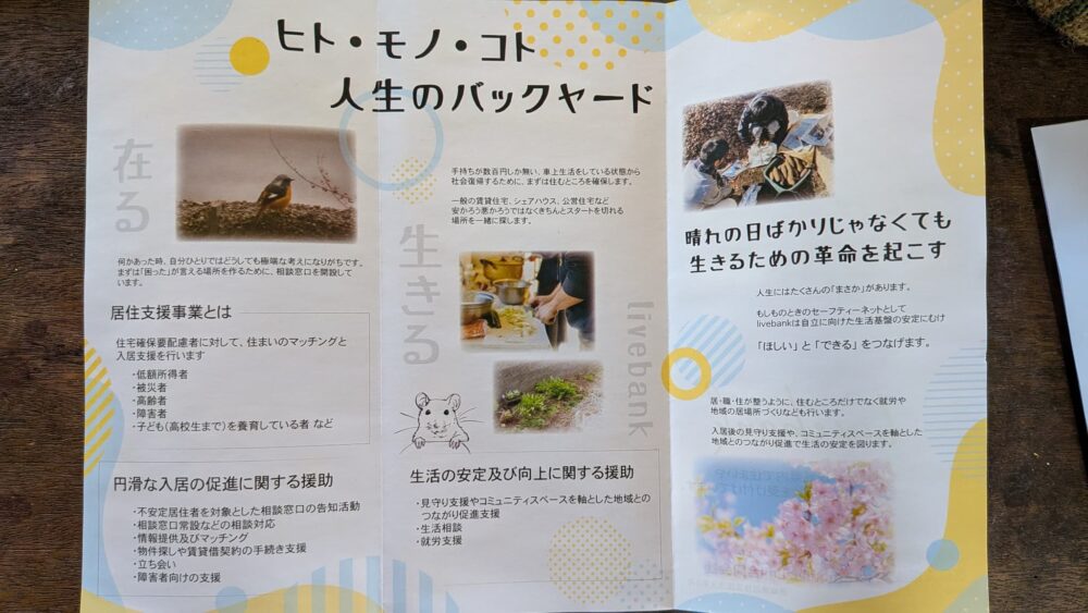 コミュニティスペース本拠地の母体の会社です。本拠地の運営に加えて上記のリーブバンク、就労・自立支援などの事業も行っています。